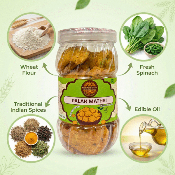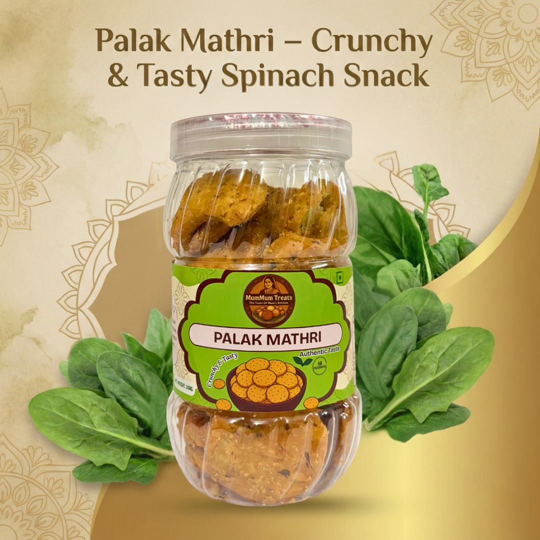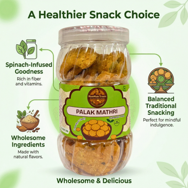 Discover a healthier twist to traditional snacking with MumMum Treats Palak Mathri – a crispy and tasty delight infused with the goodness of spinach (palak). Made with wheat flour, fresh spinach, and select spices, this mathri brings together the perfect crunch and earthy flavors of greens in every bite.